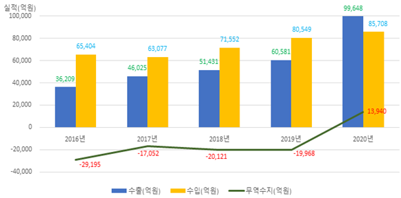 수출실적은 약 2조 3,825억원으로 2019년 대비 57.3% 증가했고 수입실적은 14억 8,766만 달러로 2019년 대비 11.3% 증가했다.