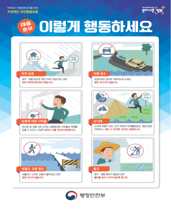 이에 따라 중대본은 관계부처와 지자체 등에 우선 재난문자, TV자막방송, 전광판 등 가용매체를 총동원해 야외활동 자제 등 행동요령 안내를 강화하도록 하고 국립공원 등산객 대피와 등산로·탐방로 통제, 산간·계곡, 야영장, 캠핑장 등에 대피방송 실시와 예찰 활동을 강화하도록 했다.