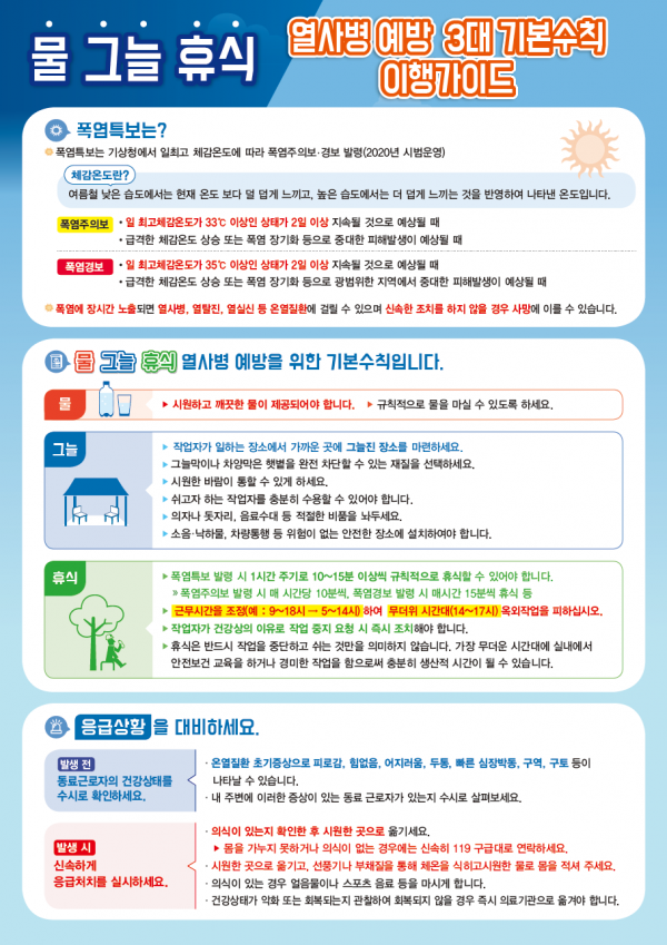 아울러 생수, 냉장·냉동고 임대비, 간이휴게시설, 쿨토시, 아이스조끼 및 정제소금 등을 산업안전보건관리비로 사용할 수 있는 만큼 적극적으로 활용해 폭염에 철저히 대응해 달라고 당부했다.