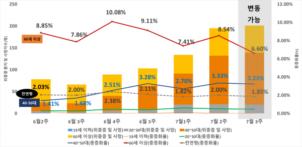 지난 6월 2주와 7월 2주의 중증화율을 비교한 결과, 확진자가 급증했다에도 60세 이상 연령층에서의 중증화율은 8% 수준으로 유지되고 있으나, 40∼50대 연령층의 위중증 및 사망자 수는 5.6배 증가, 중증화율은 2.4배 증가했다.