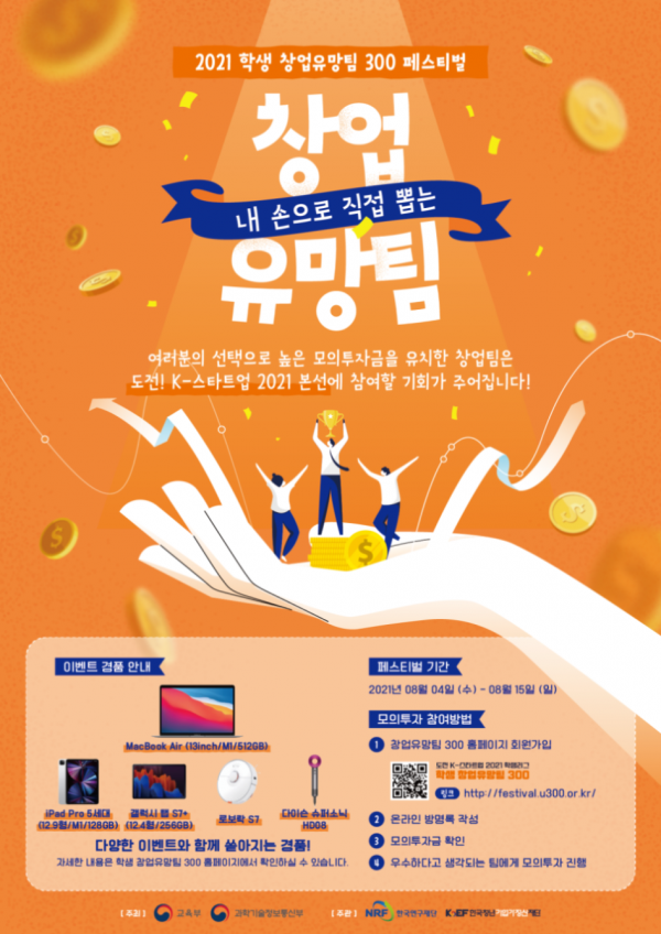 ‘2021 학생 창업유망팀 300 축제’에서는 모의투자대회 외에도, 학생창업을 응원하는 메시지를 전하는 ‘온라인 퍼즐 방명록,’ 유명 투자자와 실시간으로 소통하는 이야기 콘서트 ‘스페셜 밋업,’ 선배 창업팀의 ‘온라인 기업설명회’ 등 다양한 부대행사도 함께 진행된다.