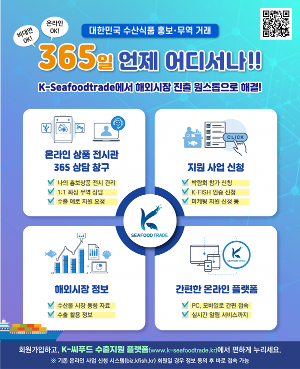 이에 해양수산부는 365일 24시간 어느 때나 우리 수출업체가 필요로 하는 정보나 무역 애로사항을 문의하고 신속하게 해결할 수 있도록 지원하기 위해 ‘K-씨푸드 수출지원 플랫폼’ 에 온라인 ‘365 상담 창구’를 개설하게 됐다.