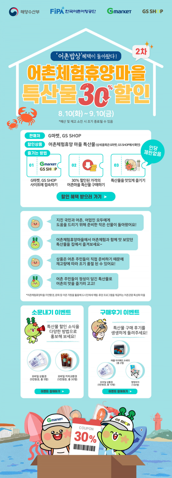 성열산 해양수산부 어촌어항과장은 “이번 할인행사를 통해 여름철 무더위로 지친 국민들이 우리 어촌에서 나는 신선한 특산물을 맛보고 건강과 활력을 되찾기를 바라며 앞으로도 코로나19 장기화로 어려움을 겪고 있는 어촌을 지원하는 사업을 다양하게 추진하겠다”고 말했다.