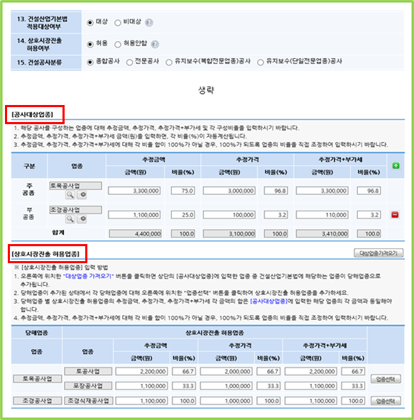 다만, 발주기관은 종합업체와 전문업체의 입찰참여 자격요건을 시스템으로 제어할 수 있도록 입찰공고 시 ‘공사대상업종’과 ‘상호시장진출 허용업종’을 입력해야 한다.