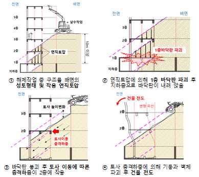 계획과 달리 무리한 해체방식을 적용해 건축물 내부 바닥 절반을 철거한 후 3층 높이의 과도한 성토를 해 작업 하던 중 1층 바닥판이 무게를 이기지 못하고 파괴됐으며 지하층으로 성토가 급격히 유입되면서 상부층 토사의 건물전면 방향 이동에 따른 충격이 구조물 전도붕괴의 직접원인이 됐다.