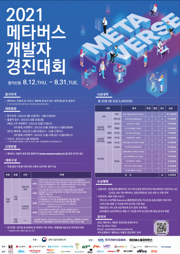 메타버스에 관심 있는 대학생, 일반인이라면 누구나 참가할 수 있으며 최종 20개 우수팀을 선발해 총 9,400만원의 상금과 과기정통부 장관상, 한국전파진흥협회장상, 후원기업 대표상을 수여할 예정이다.