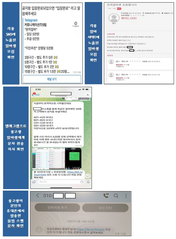불법 스팸문자 전송 아르바이트는 최근 중고생들 사이에서 손쉬운 신종 알바로 입소문이 난 상황이며 참여한 중고생들은 대부분 법적으로 문제없는 아르바이트로 인식하고 있는 실정이다.