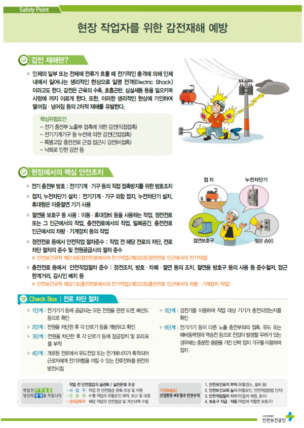 권기섭 산업안전보건본부장은 “전기를 사용하거나 전로 주변 작업 현장이라면 언제든 감전 재해가 발생할 수 있다”며 “감전 위험작업 전 전로 차단 전기기계·기구 접지 및 누전차단기 설치·점검 전로 주변 작업 시 방호·보호 조치 3가지 원칙만 준수해도 효과적으로 감전 재해를 예방할 수 있다”고 설명했다.
