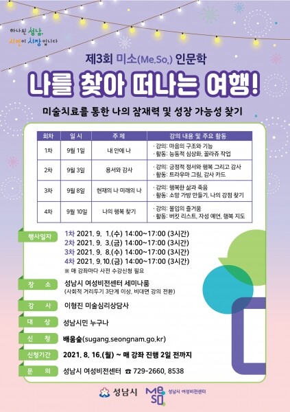 ‘나를 찾아 떠나는 여행’을 대주제로 오는 9월 1일과 3일 8일 10일 오후 2시~5시 수정구 태평동 성남시 여성비전센터 세미나룸에서 강좌가 열린다.
