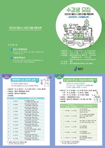 신청은 용인시 평생학습관 홈페이지에서 할 수 있으며 프로그램당 16명과 20명을 선착순 마감할 계획이라고 전했다.