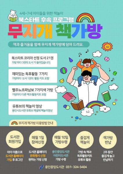 도서관 관계자는 “무지개 책가방이 코로나19로 집 안에만 있어야 하는 부모와 아이들에게 작은 즐거움이 되길 기대한다”며 “앞으로도 아이들이 책과 친밀해질 수 있도록 다채로운 프로그램을 운영해 나갈 것”이라고 말했다.