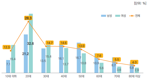 대부분의 연령대에서 자살시도자는 감소했으나, 19세 이하, 20대는 증가했고 특히 여성 자살시도자 중 20대 비율은 전년 대비 5.9%p 증가 26.7%→ 32.6%)한 것으로 나타났다.