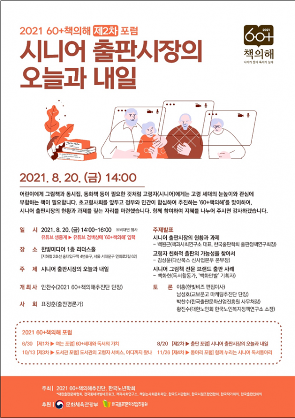 고령층 출판시장의 오늘과 내일을 고찰하기 위해 책과사회연구소 백원근 대표가 ‘어르신 출판시장의 현황과 과제’를, 다산북스 신사업본부 김상윤 본부장이 ‘고령자 친화적 출판의 가능성을 찾아서’를, ‘백화만발’ 어르신 그림책 연작의 기획자인 백화현 독서활동가가 ‘어르신 그림책 전문 브랜드 출판 사례’를 주제로 발표한다.