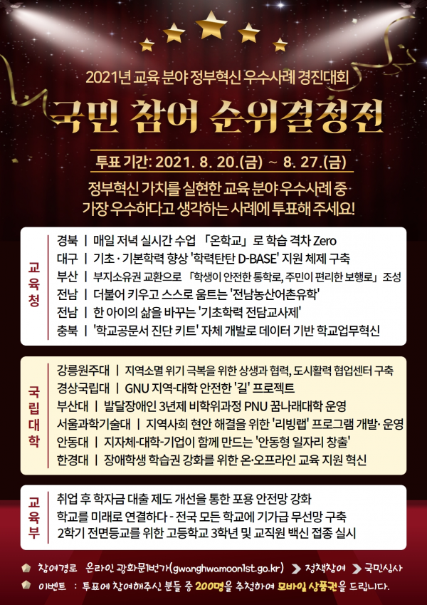 올해는 기관별 특색을 고려해 시도교육청, 국립대학, 교육부로 구분해 우수사례 순위를 결정하며 누리집 광화문1번가에서순위결정을 위한 온라인 국민투표를 진행한다.
