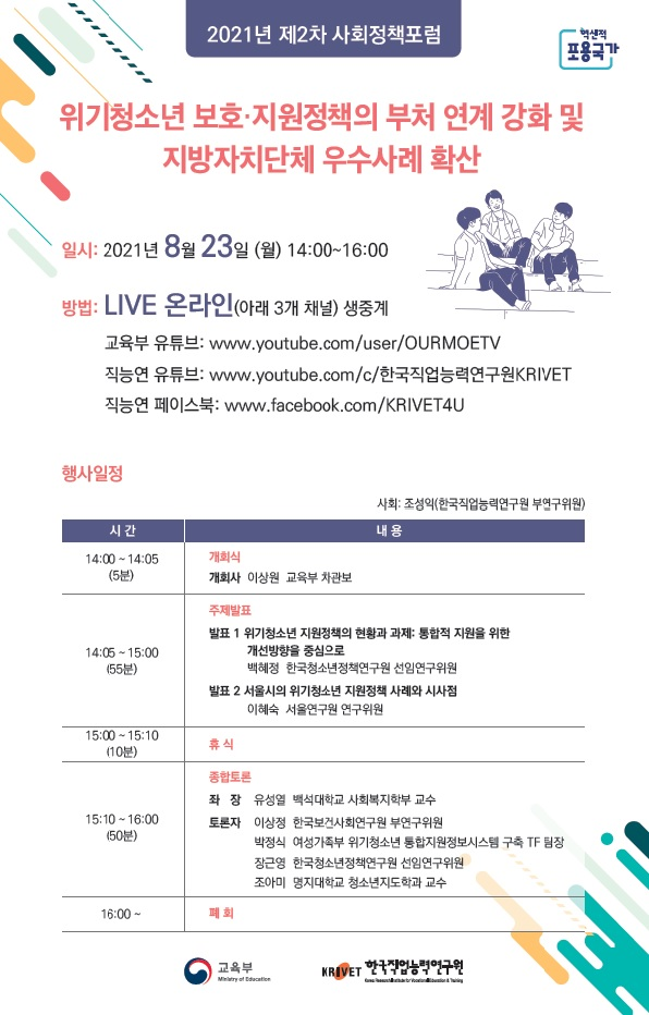발제 이후에는 학계, 연구계와 관련 부처 등 전문가들을 지정토론자로 초청해 위기청소년 보호·지원 체계와 현장 중심의 대응을 위한 다양한 의견을 나눈다.