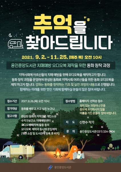 도서관 관계자는 “코로나19로 집에 있는 시간이 많아지면서 개인의 창작에 대한 관심 또한 높아지고 있다”며 “이번 강좌를 통해 시민들이 창작에 대한 갈증을 해소하고 치매예방 오디오북을 제작하는 뜻깊은 일에 참여하는 좋은 기회가 되길 바란다”고 말했다.