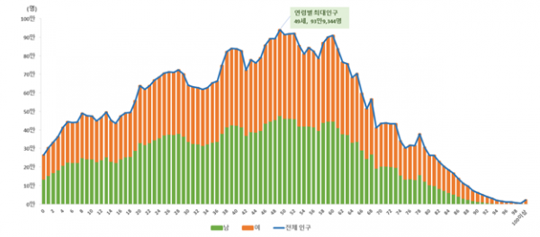 가장 인구가 많은 연령은 49세였으며 평균연령은 43.2세로 전년대비 0.6세 높아졌고 남성 42.0세, 여성 44.3세로 여성이 2.3세 높았다.