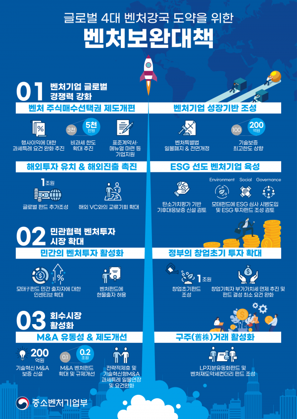 ?벤처특별법 등 벤처기업 육성제도는 제1벤처붐 당시에는 매우 혁신적이었으나, 현재 세제·입지 등은 활용도가 매우 낮으며 스톡옵션 등 일부는 혜택이 축소?정부 자금이 들어오는데 민간 자금을 매칭하지 못해 펀드 결성이 어려운 사례 다수, 벤처캐피탈 업계가 성장하기 위해서는 민간 자본이 더 유입될 필요?벤처투자 시장에는 지속적으로 돈이 유입되고 있는데 회수 단계에서 병목현상 발생, 구주매각과 인수합병가 활성화되지 않아 기업공개말고는 대안이 없는 상황이에 정부는 벤처생태계를 구성하는 벤처기업-벤처투자-회수시장 3대 분야에서 그간 추진했던 정책을 보완하는 ‘벤처보완대책’을 수립했다.