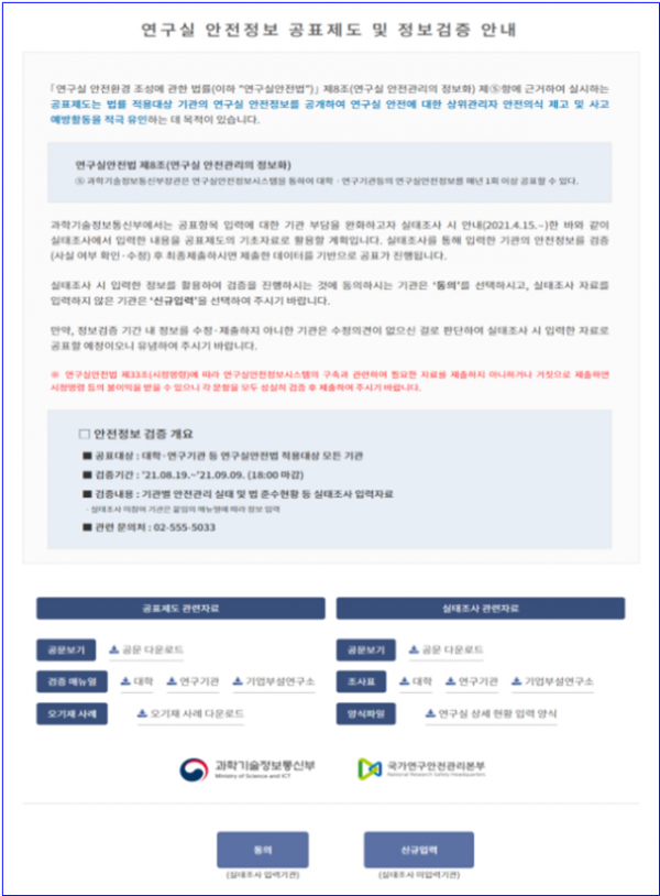 이번 정보검증은 ’21년 상반기에 실시한 실태조사를 통해 확보한 연구실 안전정보의 신뢰성 제고를 위해 기관이 자체적으로 검증하는 절차로써 다음 달 9일까지 진행된다.