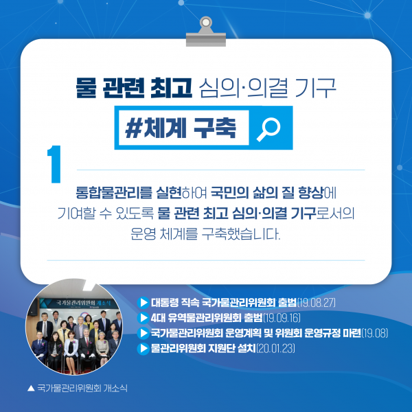 6월에는 향후 10년간의 우리나라 통합물관리 정책을 이끌 이정표로서 제1차 국가물관리기본계획을 확정했다.