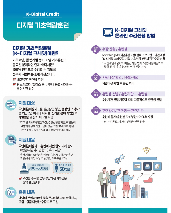 ‘K-디지털 크레딧’은 청년 등이 디지털 기초역량 부족으로 노동시장 진입·적응에 어려움을 겪지 않도록 ‘21년부터 새롭게 시작한 사업으로 팀스파르타, 엘리스, 모두의연구소 등 민간의 인기 있는 훈련기관에서 수강할 수 있는 훈련비를 1인당 50만원 씩 지원하는 사업이다.