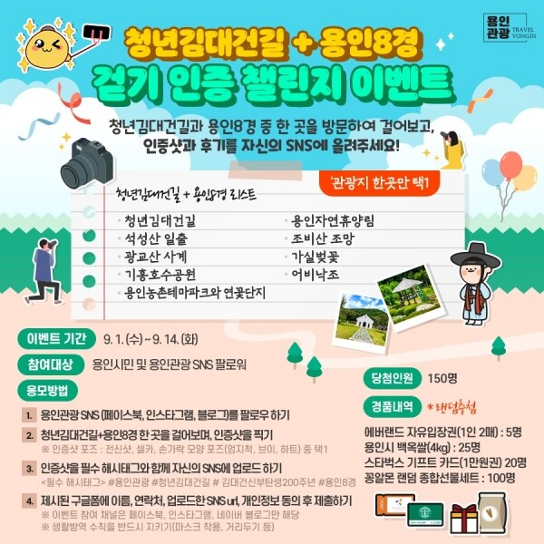 챌린지 참여방법은 먼저 용인관광 공식 페이스북과 인스타그램을 팔로우하거나 네이버 블로그를 이웃추가 한 뒤 청년 김대건길과 용인 8경 중 한 곳을 걸은 후 걷기 인증샷과 필수 해시태그를 자신의 SNS 계정에 업로드하면 된다.