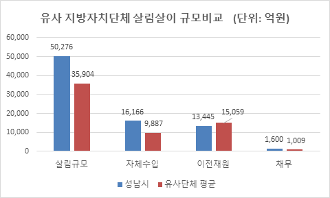 성남시의 재정 규모, 자체 수입은 유사자치단체보다 많고 이전재원은 낮아 전반적으로 재정 건전성이 우수하다는 분석이다.