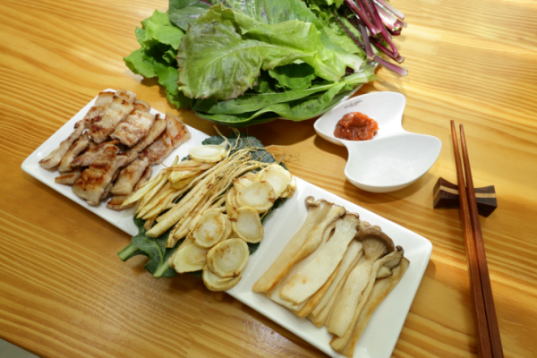 인삼 삼겹살은 인삼을 0.3cm로 얇게 썬 뒤 삼겹살과 함께 구워 쌈으로 즐기는 요리이다.