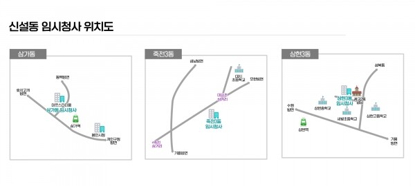 각 동은 신청사가 건립되기 전까지 임시사무실에서 업무를 처리할 계획이며 삼가동 행정복지센터는 동백죽전대로 61 미르스타디움 3층에, 죽전3동 행정복지센터는 수지구 대지로 42, 1층에, 상현3동 행정 복지센터는 수지구 법조로 223 큐브주차빌딩 1층에 마련했다.