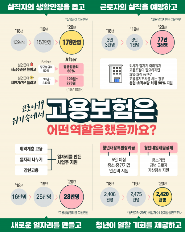 이와 더불어 어려운 경제상황을 고려해, 사회보험료 지원 등 중소·영세 기업 지원사업을 확충하고 약 5천억원 규모의 청년 일자리 창출 사업 등을 일반회계에서 부담토록 함으로써 고용보험기금의 지출 축소에 따라 기업·근로자들에 대한 고용서비스 수준이 저하되지 않도록 했다.