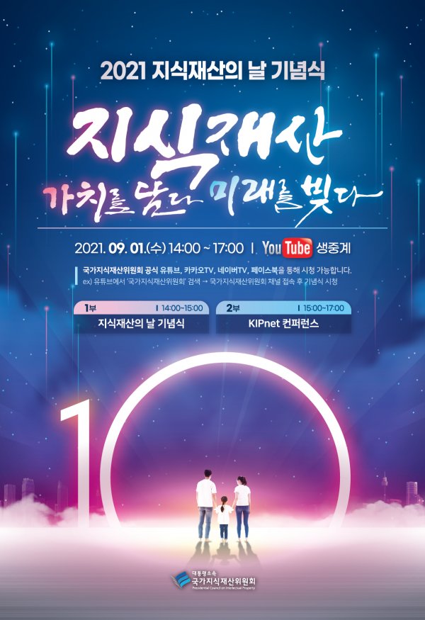 정상조 국가지식재산위원회 위원장은 “국가지식재산위원회의 지난 10년의 노력을 토대로 이번 기념식이 앞으로 지식재산이 빚어갈 미래 가치에 대해 국민과 함께 생각해 보는 계기가 되었으면 한다”며 “지식재산이 대한민국 발전의 핵심 원동력으로 자리 잡게 되기를 기원한다”고 밝혔다.