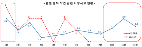 벌목작업은 전년 동기간 대비 사망사고가 175% 증가했고 최근 6년간 사망사고를 분석한 결과 10월부터 이듬해 1월까지 사망사고가 증가하는 경향이 있어 사전 예방 차원의 점검이 필요하다.