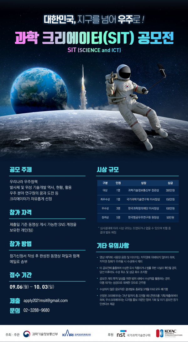 이번 공모전의 주제는 우주이며 한국형 발사체 누리호 발사, 한국형위성항법시스템 개발 등 우주 정책 및 연구개발 사업에 대한 국민적 관심을 높이기 위해 마련됐다.