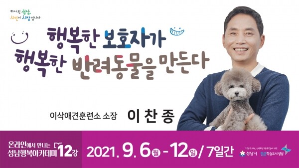 ‘행복한 보호자가 행복한 반려동물을 만든다’를 주제로 한 이찬종 소장의 강연은 시 공식 유튜브 채널 ‘성남TV’에서 시청할 수 있다.