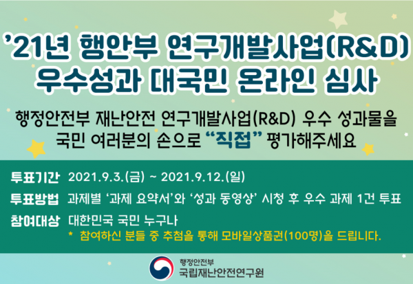 이번 온라인 심사는 재난안전 연구개발사업에 대한 국민의 관심을 높이고 국민이 체감할 수 있는 성과를 발굴하기 위해 마련됐다.