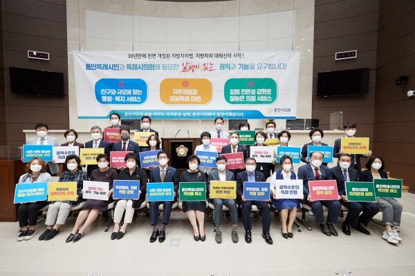 용인시의회는 특례시민의 상대적 역차별을 해소하고 특례시 위상에 걸맞은 행정·재정·의정 서비스를 제공할 수 있는 권리를 가질 수 있도록 중앙정부는 ‘지방자치법’ 관계법령 제·개정 일정 등을 즉각 공유하고 광역단체를 경유한 의견수렴이 아닌 특례시 및 특례시의회와 직접 소통하라 광역수준의 의정수요에 대응하고 복잡다양한 집행기구의 사무와 예산을 효과적으로 견제할 수 있도록 특례시의회 정책지원 전문인력의 직급을 광역의회와 동일하게 적용하라 일부 광역도시와 인구, 재정상황 등이 유사함을 적극 반영해 특례시의회의 의원들에 대한 처우에 있어 불합리한 차별을 해소하라는 내용을 담은 ‘지방자치법’ 관계법령 개정 촉구 건의안을 채택하고 국회, 청와대, 행정안전부, 경기도 등에 송부할 계획이라고 전했다.