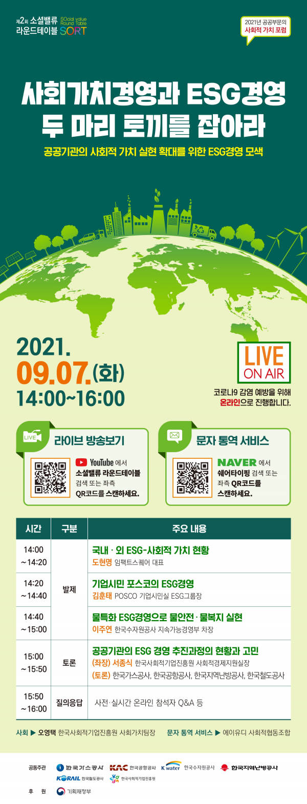 제2회 SORT에서는 공공기관에 적용 가능한 사회적 가치와 ESG 연계 방안을 모색하는 국내·외 ESG-사회적 가치 현황을 시작으로 민간과 공공부문의 ESG경영 사례 및 공공기관의 ESG경영 추진과정의 현황과 고민을 토론에서 논의할 예정이다.