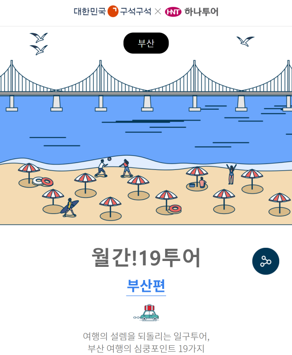 19투어는 하나투어의‘1’과 대한민국 구석구석의‘9’를 더해 국내여행정보 대표 사이트와 대표 여행사가 만나 국내 여행업계 상생협력 플랫폼을 만들고자 하는 협업 프로젝트를 뜻한다.