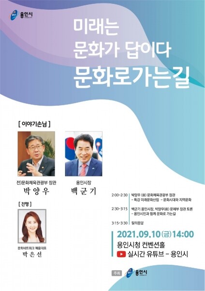 시 관계자는 “용인시 문화의 현주소를 진단하고 미래를 전망해보는 매우 귀한 시간이 될 것”이며 “유튜브로 생중계되는 만큼 많은 시민분들이 함께 참여해 소중한 의견을 보다음달라”고 말했다.