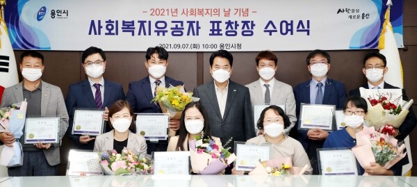 이날 용인시청에서 열린 수여식에는 백군기 시장이 참석해 관내 노인복지관, 장애인복지관 등에서 근무하고 있는 사회복지사 및 자원봉사자와 읍면동 지역사회보장협의체, 사회복지단체, 봉사동호회 등에서 이웃사랑을 실천하고 있는 사회복지유공자 10명에게 표창장을 전달했다.