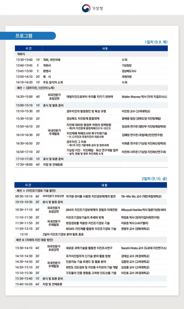 첫째 날에는 ‘경주지진, 5년간의 노력’이라는 주제로 국외 전문가 초청 강연을 가진 뒤, 주제발표와 토론을 통해 범정부 차원의 지진 대응체계 마련을 위한 전문가 의견을 청취한다.