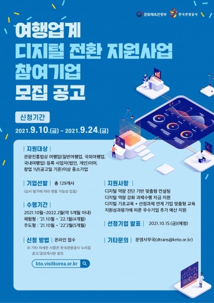 동 사업은 코로나19로 피해를 입은 여행사의 위기 극복과 미래 환경변화 대응을 위해 올해 처음 시행하는 사업으로 신규 수익 모델 발굴, 디지털 콘텐츠 제작 및 홍보, 디지털 기반 인프라 도입 등 디지털 전환 과제 수행을 위한 자금, 컨설팅, 역량강화 교육 등을 지원한다.