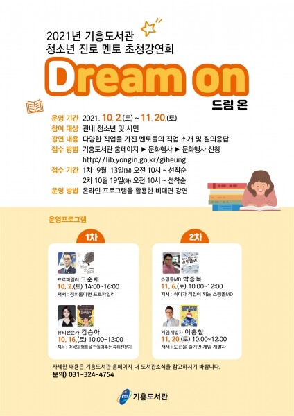 강연에는 관내 청소년 및 시민 누구나 참여할 수 있으며 기흥도서관 홈페이지에서 각 강연당 100명을 모집한다.