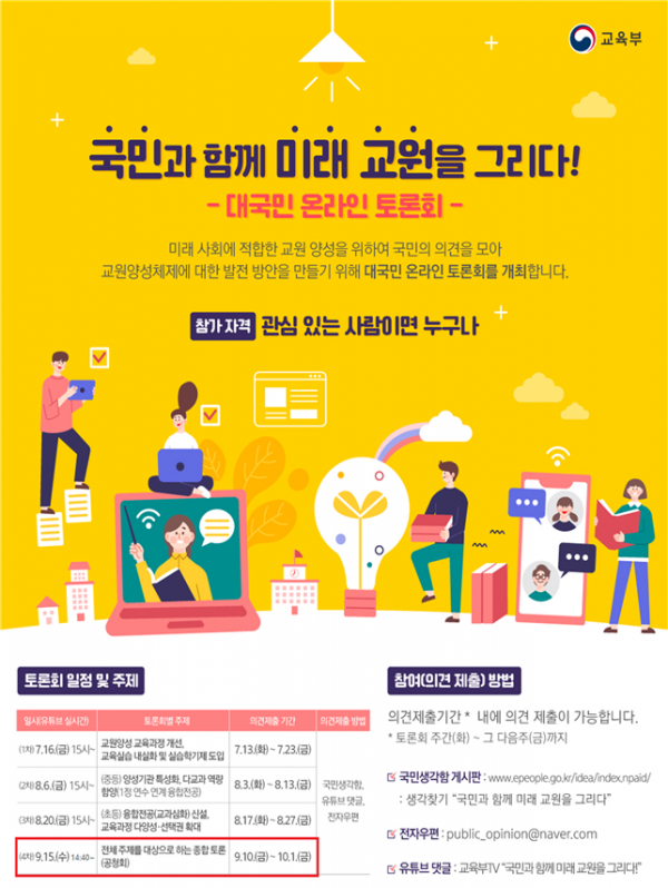 이번 공청회는 대국민 의견 수렴의 마지막 절차로 발전방안과 토론문을 보고 국민 누구나 의견을 개진할 수 있도록 국민생각함을 마련했고 교육부 누리집을 통해서도 접속할 수 있다.