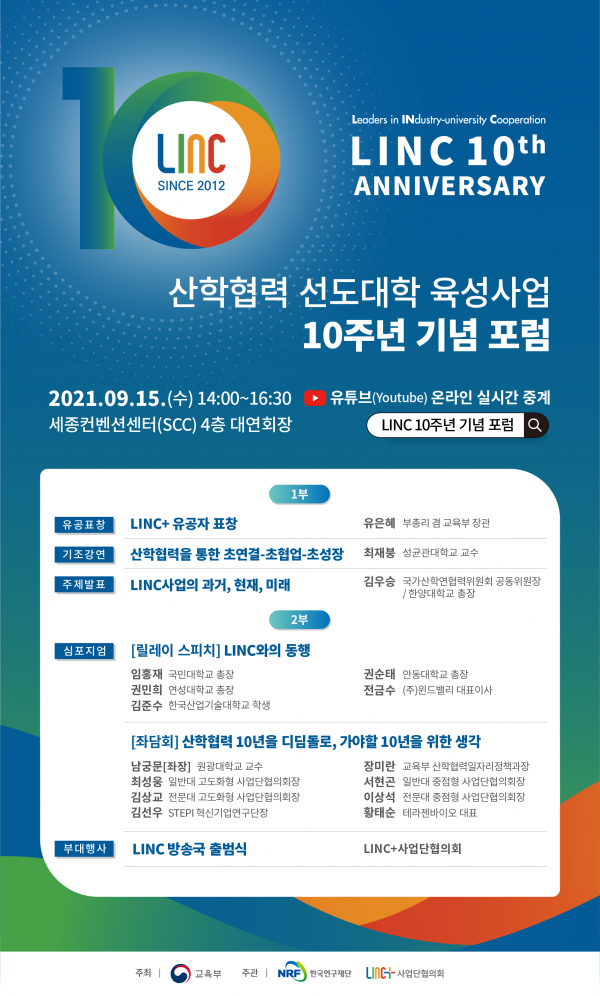포럼 2부에서는 ‘링크와의 동행’을 주제로 그간 사업에 참여해온 대학총장과 링크 가족기업 관계자, 참여 학생의 릴레이 스피치 및 산학연협력 발전을 논의하는 전문가 8인의 좌담회가 이어진다.