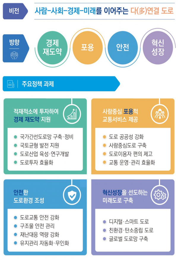‘제2차 국가도로망종합계획’은 ‘사람, 사회, 경제 그리고 미래를 이어주는 다연결 도로’를 비전으로 설정하고 경제 재도약, 포용, 안전, 혁신성장의 네 가지 가치를 중심으로 미래 10년의 과제를 제시했으며 주요내용은 다음과 같다.