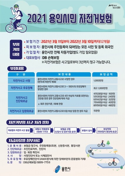 시는 친환경 교통수단인 자전거를 안심하고 탈 수 있는 환경을 제공하기 위해 지난 2016년부터 용인시민 자전거 보험에 가입하고 있다.