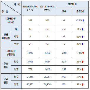 연휴 기간 중 화재는 일평균 71건으로 지난해와 비슷했으며 구조 출동은 일평균 937건으로 지난해 694건보다 35%, 구급 출동은 일평균 5천211건으로 지난해 4천330건보다 20%로 각각 증가했다.