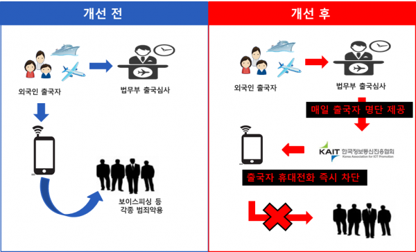 출국한 외국인의 휴대폰을 이용해 보이스피싱 등 각종 범죄행위에 악용하는 사례가 빈번하게 발생됨에 따라, 법무부는 명의도용방지서비스 등을 제공하는 한국정보통신진흥협회와 협력체계를 강화해 휴대폰 차단 조치에 필요한 외국인 출국자 명단을 기존 3개월에서 매일 제공으로 개선해, 출국 외국인에 대한 보다 신속한 휴대폰 차단 조치를 통해 범죄악용을 방지할 수 있게 했다.