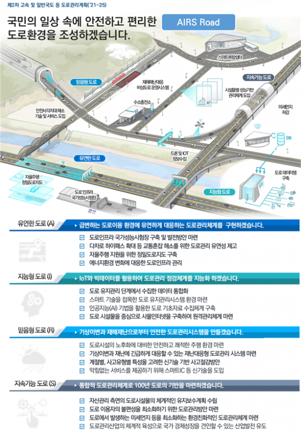 드론을 활용해 산사태·비탈면 위험지역을 점검하고 사물인터넷과 첨단센서 및 AI 기반의 영상취득장치 등을 활용해 교량·터널·비탈면 등 도로시설물의 상태를 실시간으로 수집·관리하는 체계를 구축한다.